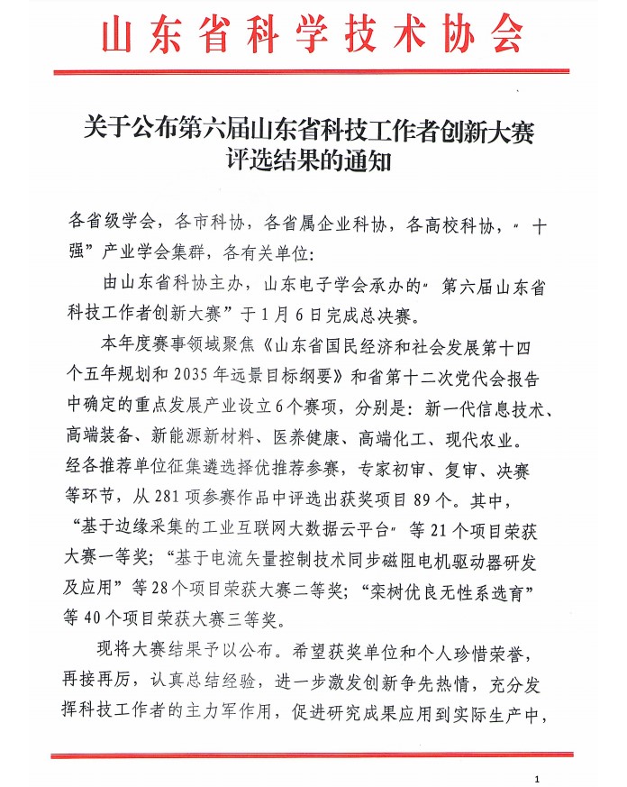 本屆大賽由山東省科學(xué)技術(shù)協(xié)會主辦,山東電子學(xué)會承辦,主題為“創(chuàng)新科技資源集聚 提升區(qū)域產(chǎn)業(yè)能級”,旨在激發(fā)廣大科技人員創(chuàng)新爭先熱情,促進(jìn)科技創(chuàng)新成果與企業(yè)、市場、資本對接,推動技術(shù)與資源緊密結(jié)合,加快技術(shù)成果轉(zhuǎn)化應(yīng)用,實(shí)現(xiàn)多方共贏,助力我省產(chǎn)業(yè)高質(zhì)量發(fā)展。此次大賽聚焦《山東省國民經(jīng)濟(jì)和社會發(fā)展第十四個五年規(guī)劃和2035年遠(yuǎn)景目標(biāo)綱要》和省第十二次黨代會報告中確定的重點(diǎn)發(fā)展產(chǎn)業(yè)設(shè)立6個賽項:新一代信息技術(shù)、高端裝備、新能源新材料、醫(yī)養(yǎng)健康、高端化工、現(xiàn)代農(nóng)業(yè)。經(jīng)各推薦單位征集遴選擇優(yōu)推薦,專家初審、復(fù)審、決賽等環(huán)節(jié),共評選出一等獎21項,二等獎28項,三等獎40項。