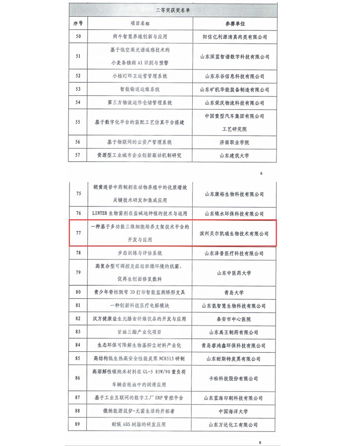 近日,山東省科學(xué)技術(shù)協(xié)會公布關(guān)于第六屆山東省科技工作者創(chuàng)新大賽評選結(jié)果的通知。濱州貝爾凱瑞生物技術(shù)有限公司總經(jīng)理,梅建國博士主持的項目“一種基于多功能三維細(xì)胞培養(yǎng)支架技術(shù)平臺的開發(fā)與應(yīng)用”榮獲本屆大賽三等獎。我公司是本次大賽在動物細(xì)胞培養(yǎng)技術(shù)領(lǐng)域唯一的獲獎單位,這一成果和榮譽(yù)的取得,表明我公司在該領(lǐng)域的技術(shù)創(chuàng)新走在了全省前列,也彰顯了我公司扎實(shí)的科研開發(fā)工作所取得的顯著成效。