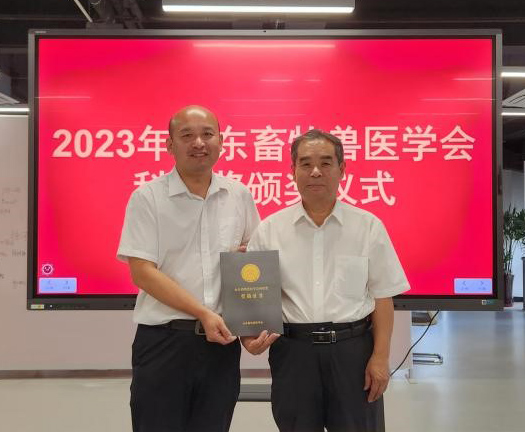 山東畜牧獸醫(yī)學(xué)會(huì)副理事長(zhǎng)兼秘書(shū)長(zhǎng)崔言順教授為梅建國(guó)博士頒發(fā)獲獎(jiǎng)證書(shū)